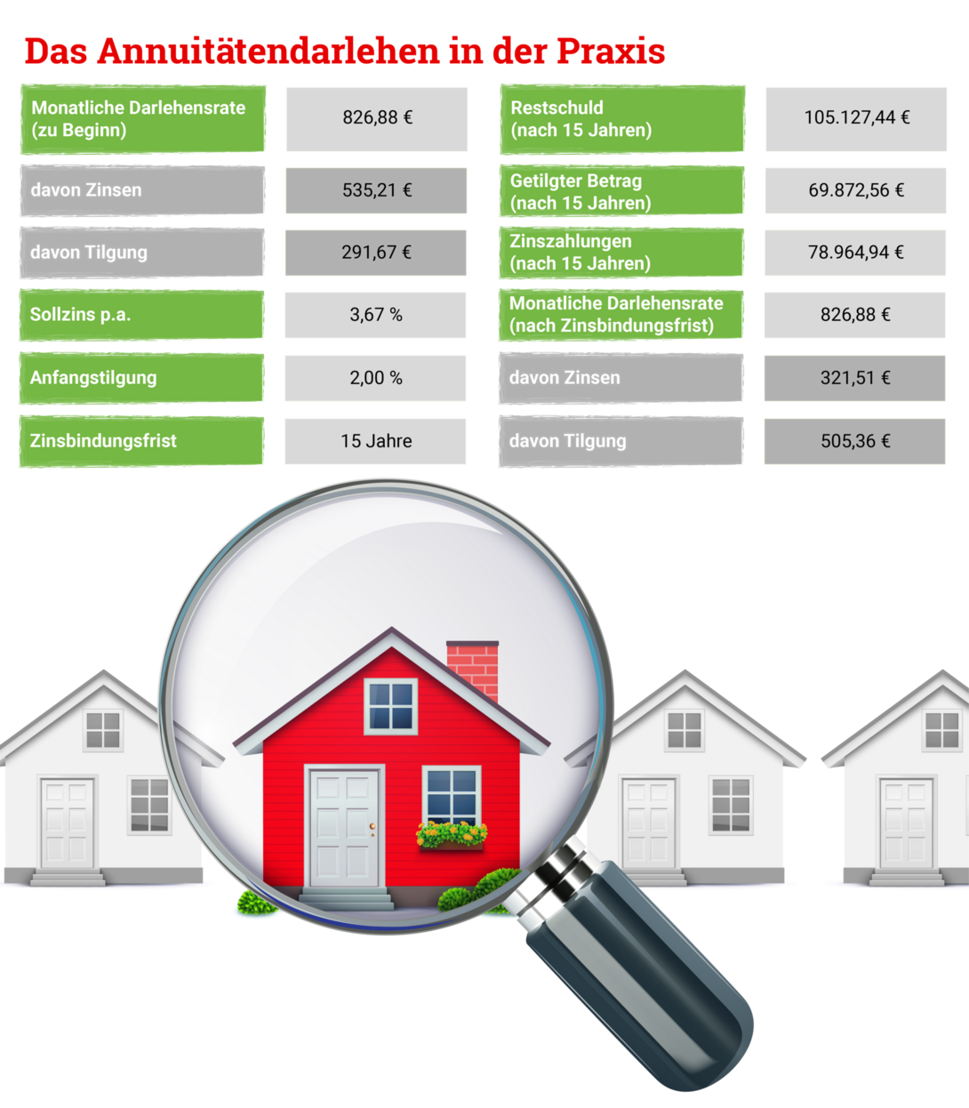 Beim Annuitätendarlehen erfahren Sie beispielsweise beim Vertragsabschluss die Höhe Ihrer Restschuld, die Sie mit einer Anschlussfinanzierung tilgen können. Denn bei einer Darlehenssumme in Höhe von 175.000 Euro und Eigenkapital von 125.000 Euro beträgt die Restschuld nach 15 Jahren 105.127,44 Euro.