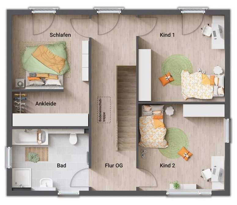 - Eltern- und Kinderbereich im Obergeschoss getrennt durch den Flur
