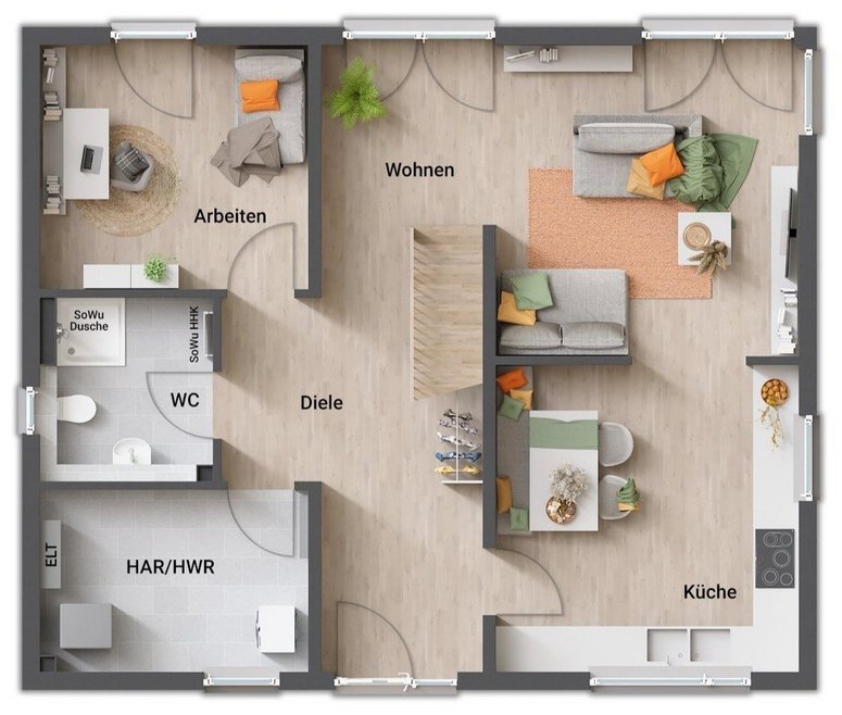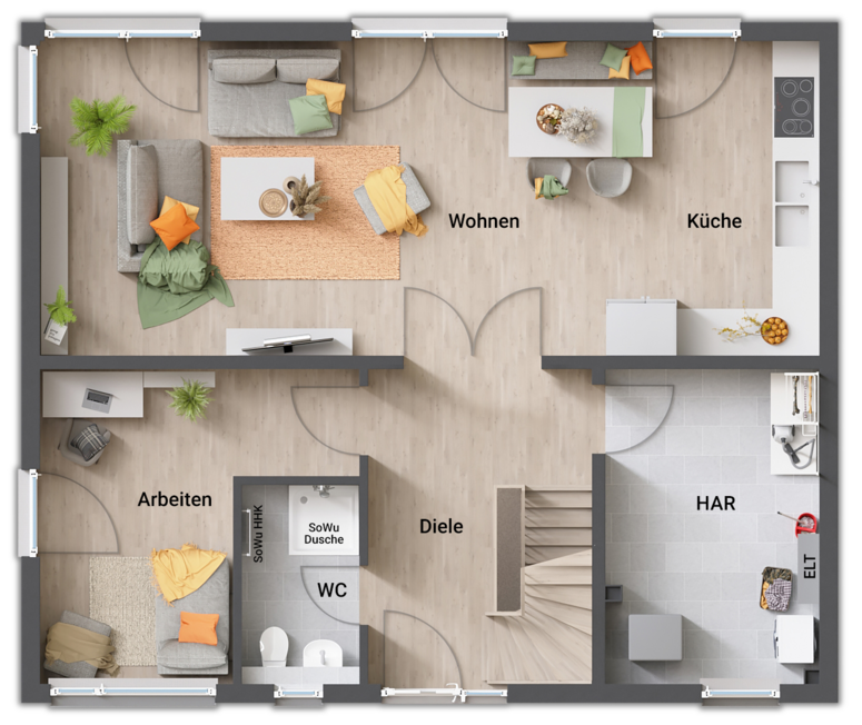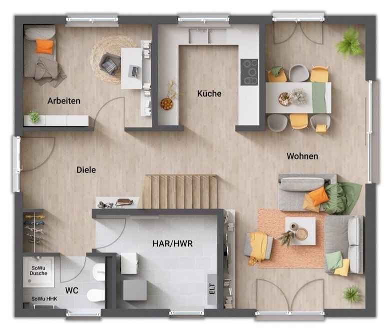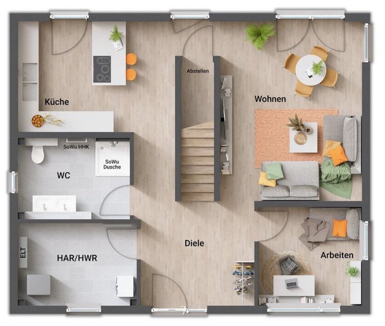 - gerade Treppe (zentral im Erdgeschoss, „teilt“ Koch- und Wohnbereich)